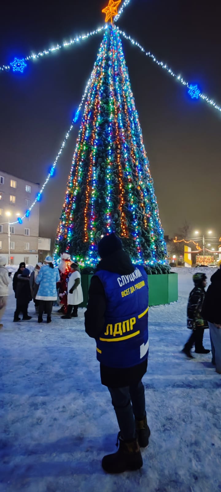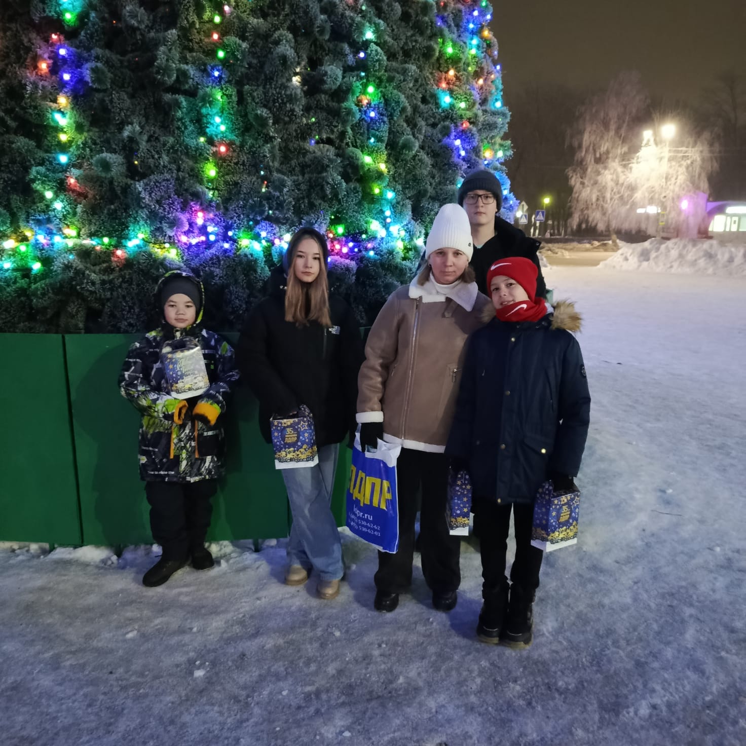 Под самой красивой и нарядной елкой города развернулось настоящее сказочное действо. Дед Мороз и Снегурочка, прибывшие от ЛДПР, принесли с собой целый мешок радости и веселья для юных жителей и их родителей